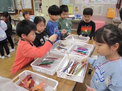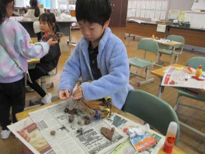 「校庭で見つけた落ち葉がきれいだったから、つけたいな」「クリスマスにおうちに飾りたいな」など、一人一人思いをもってつくりました。