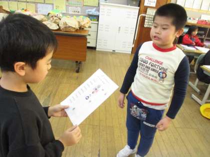 算数科の学習では、8の段まで学習が進んでいます。休み時間や帰りの会の前には、九九を唱えて、友達と答えを確認し合う姿が見られます。何も見ずにスムーズに九九を暗唱すると合格シールをもらうことができます。