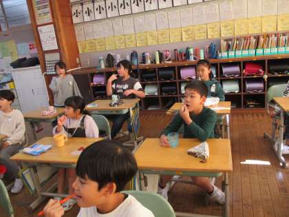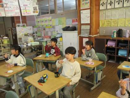 給食のあと、歯磨きのポイントを示した動画を見ながら歯磨きをしています。軽快なリズムに合わせて、楽しみながらポイントに気を付けて取り組んでいます。