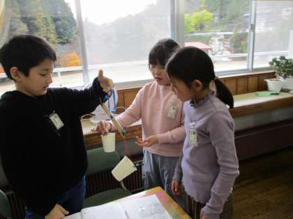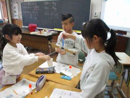 算数では、「重さ」の学習に取り組んでいます。今日は、紙コップで天秤を作り、いろいろな文房具の重さ比べをしました。予想を立てた後、実際に計っていました。その後、1円玉が何枚分となるかで、重さを量りました。みんなが共通して持っているコンパスは、約60グラムくらいでした。目に見えない重さですが、重さを体感してもらいたいものです。