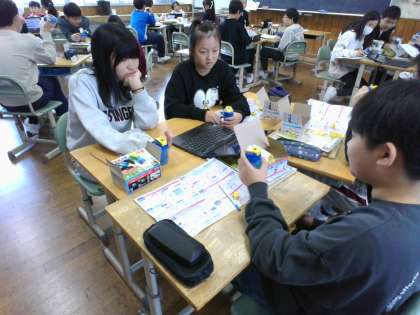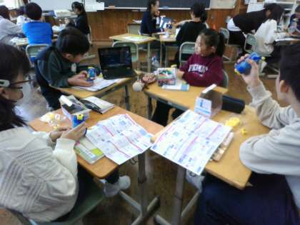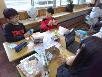 手回し発電機を使って、豆電球と発光ダイオードの電気の使用量を比べました。長い時間光っている発光ダイオードに驚いていました。