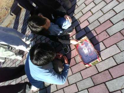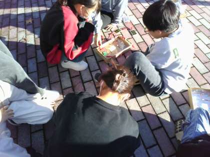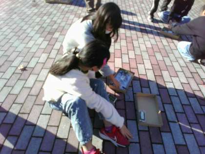 太陽が出ているタイミングで、光電池を使った実験をしました。太陽光が当たり、モーターが回ったことに感動していました。