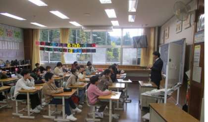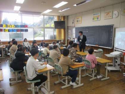 八尾中学校から先生をお招きし、合唱コンクール、校外学習、体育大会等、中学校での生活がどのようなものか、お話していただきました。給食を一緒に食べたり、数学の授業をしていただいたりし、交流をしました。中学校への進学を安心して迎えられるよう、また、楽しみになるよう願っています。