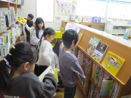 1年生の子供たちは、図書室で一人5冊本を借りました。図書館司書の先生にアドバイスをしていただきながら、本を選びました。