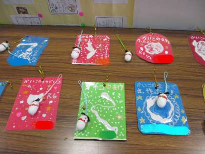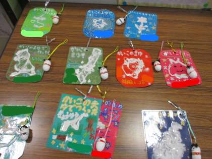 1学期育てた蚕のまゆで、先日来よりまゆ人形としおりを作りました。出来上がったものがこちらです。