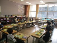 みんなで体を動かして楽しんだ後は、教室で手作り絵本の読み聞かせと、クラスのあいさつ名人の表彰が行われました。いつもは生活班ごとの給食も、今日は号車ごとに食べました。2学期も残りわずかですが、「3学期もまたやりたいね」と楽しい余韻に浸っていました。