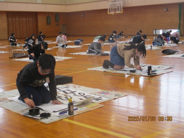 今年度の書き初め大会は、体育館で学年一斉に行いました。