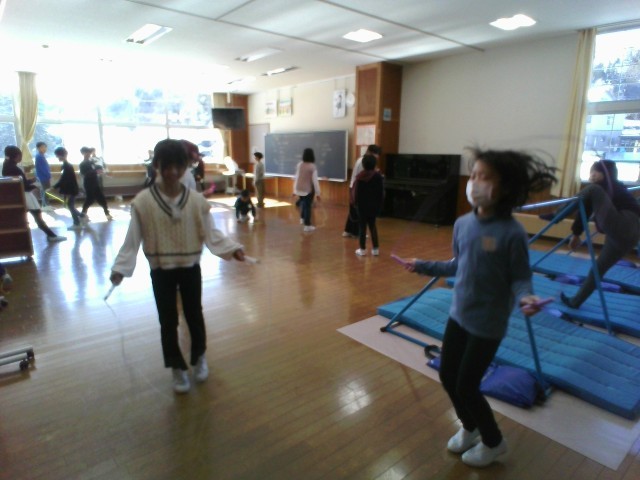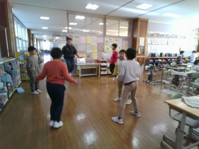短縄を持ってきてから、4年生フロアでは縄跳びブームが起こっています。