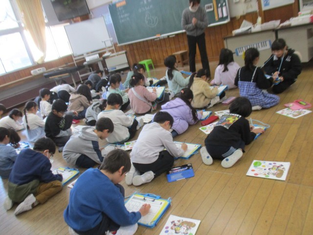写真は、歌いながらワークシートに絵を描いている様子です。
