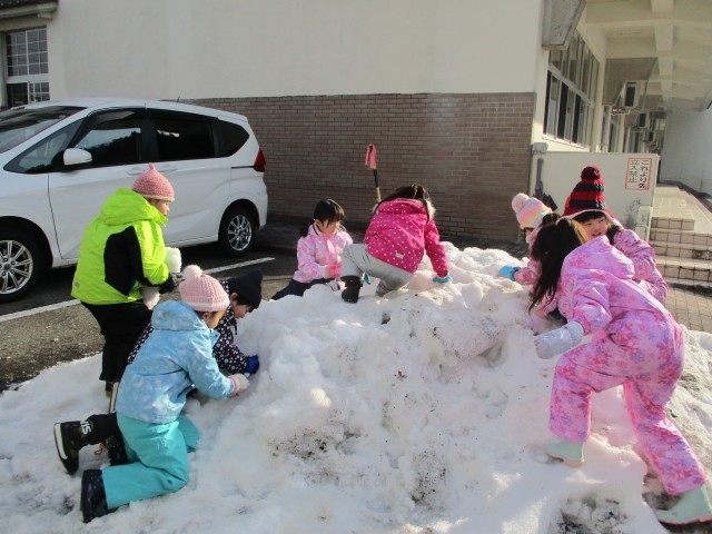 また、大きな雪山に穴を掘ってかまくらづくりをする子供たちもいました。