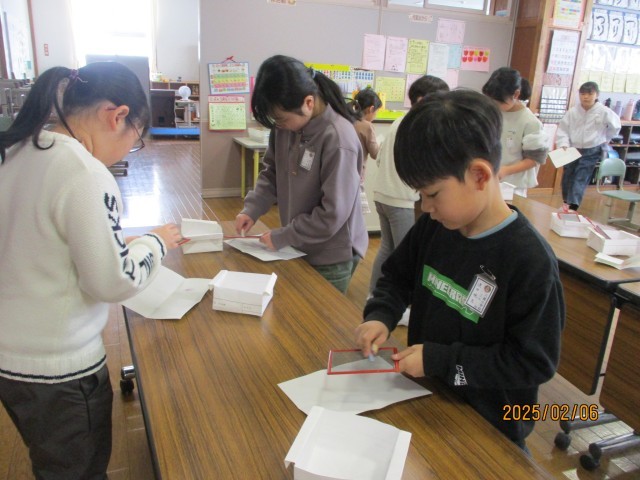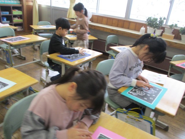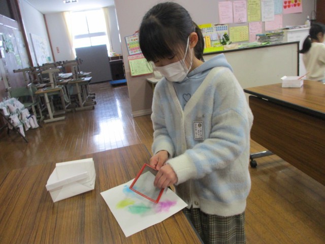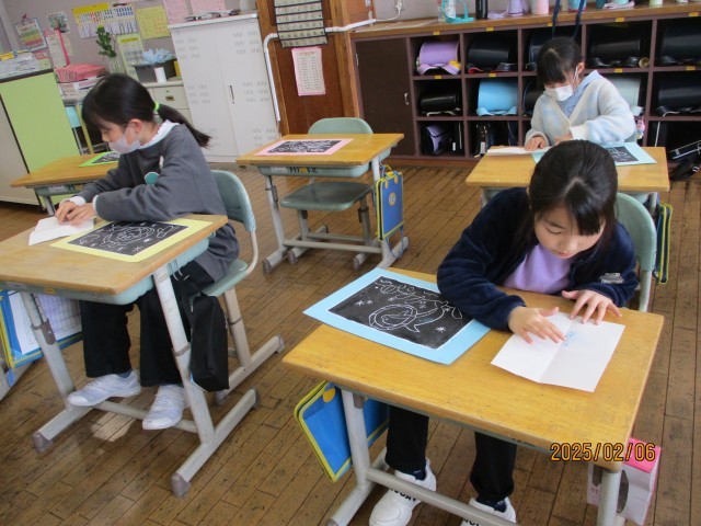 黒いインクをつけて刷った版画にコンテで色をつけました。色の組み合わせを考えながら取り組んでいました。コンテの粉を指で色をつけると、幻想的な色合いの絵に仕上がりました。