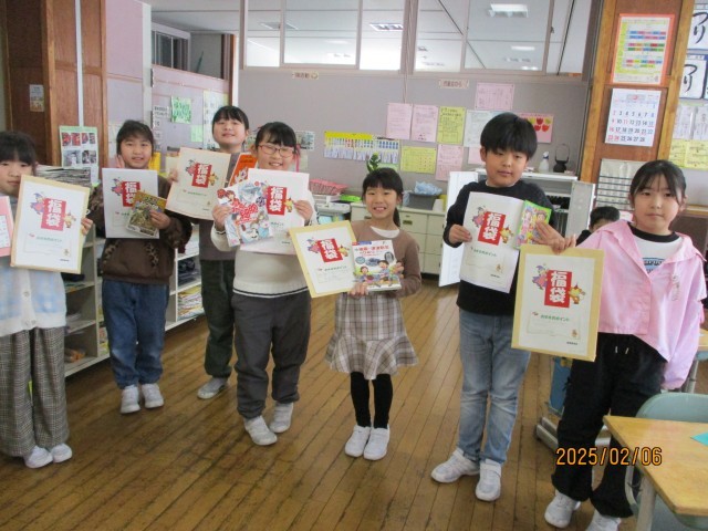 図書委員会さんが「本の福袋」を用意してくださいました。どんな本が入っているか分からないけれど、福袋の表紙には、「体の仕組みを学べる本だよ」「ふしぎなお菓子が出てくる本だよ」など図書委員さんのおすすめポイントが書かれています。おすすめポイントを参考に福袋を選んでいました。自分ではあまり選ばないような本が入っている場合もあって、興味をもって読んでいました。