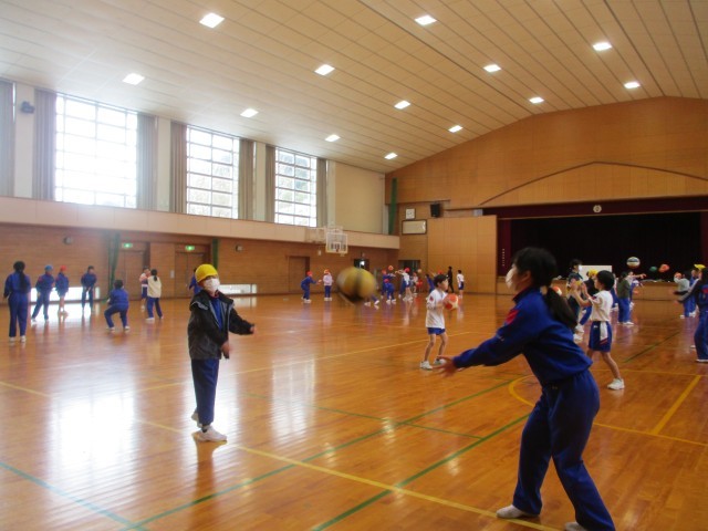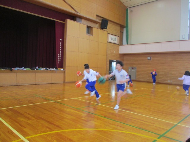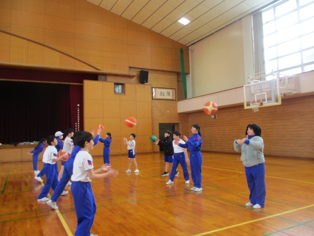 まずは、ペアでパスの練習をしました。「手は富士山!」「肘を曲げて、吸収する!」とポイントを確認しながら練習しました。ドリブルにも挑戦しました。