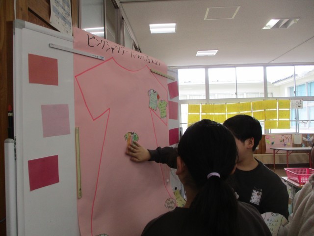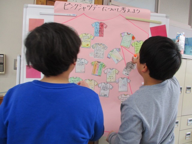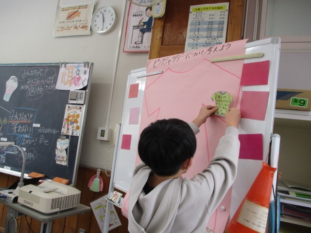 一時間の学習を振り返りました。「見た目の違いで差別をしたくない」「いじめを止められるような人になりたい」「みんなに優しくして、みんなを笑顔にしたい」たくさんの自分宣言がありました。