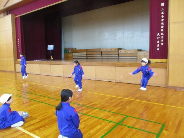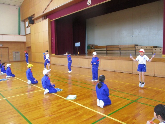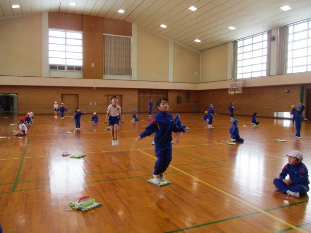 今日は縄跳び大会を実施しました。あや跳び部門、二重跳び部門、後ろ二重跳び部門に挑戦しました。始めに全体で実施し、その後上位6人よる決勝戦を行いました。どの子供もよく頑張っていました。また、決勝戦では、「がんばれ」と温かい声援が飛び交っていました。休み時間ごとに何度も1分30秒を測定し、記録更新を目指して練習している子供もいました。自分で目当てをたて、努力する姿が立派ですね。