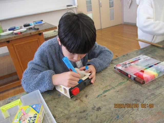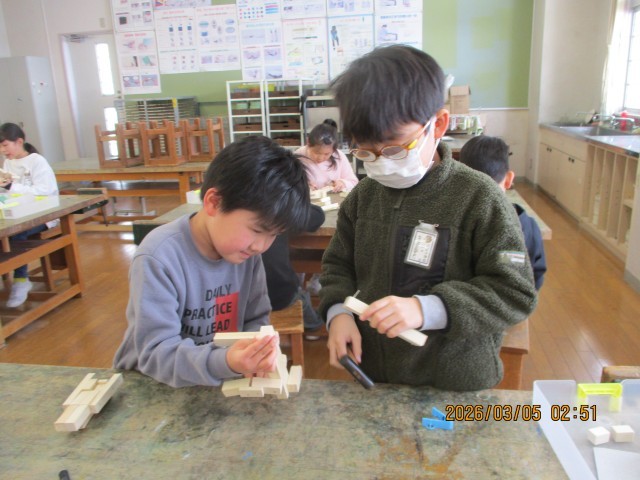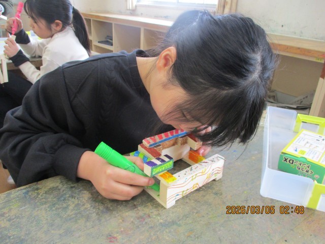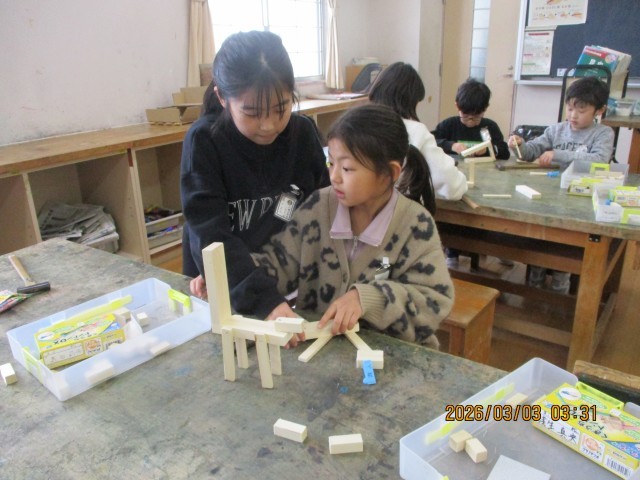 図画工作科「くぎ打ちとんとん」の学習に取り組んでいます。始めは金づちをおそるおそる使っていましたが、だんだん慣れてきて、楽しんで製作していました。出来上がった作品にマジックで色をつけている子供もいました。