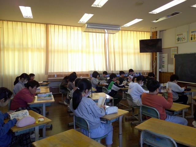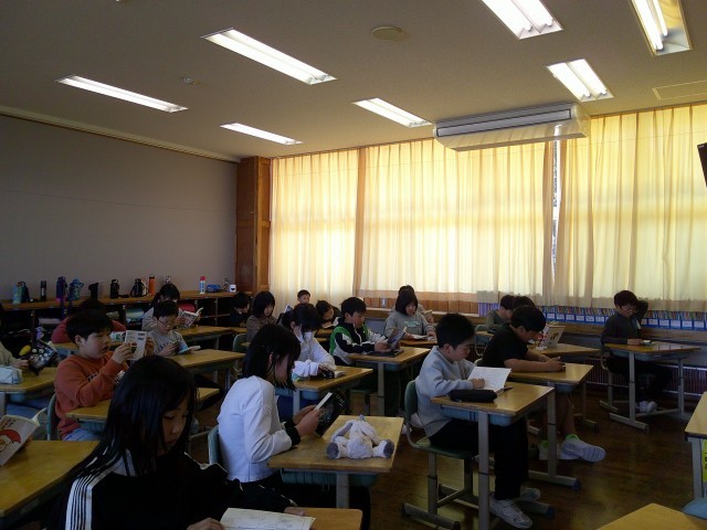 図書室で選んだ1冊をじっくり読んでいます。教室に聞こえる音は、子どもたちが本のページをめくる音だけ。