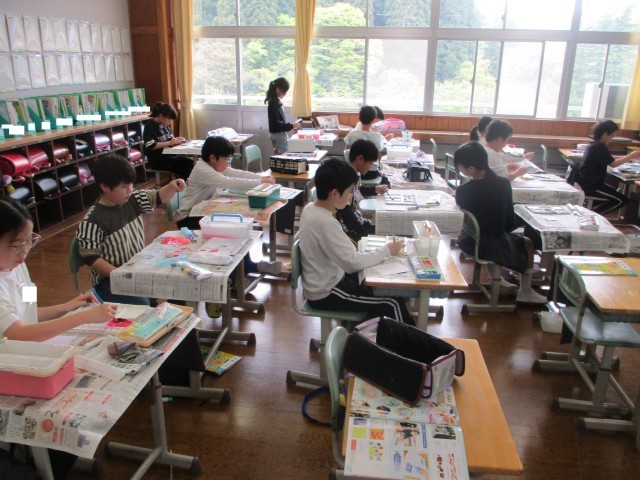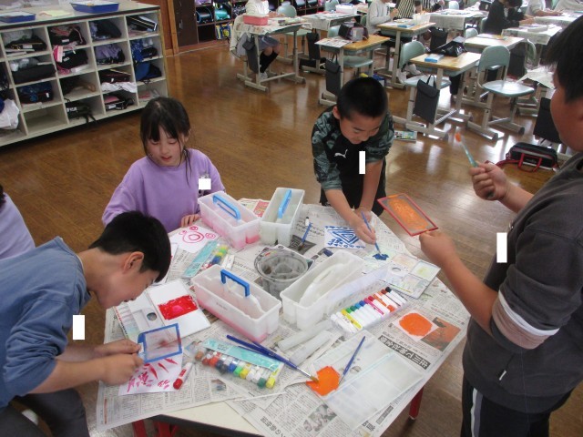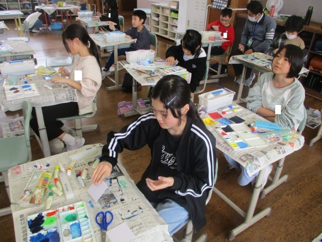 いろいろな気持ちを水彩を使って表現しました。嬉しい気持ちを暖色で表したり、怒った気持ちをとげとげ模様で描いたりするなど、自由に表現を楽しみました。