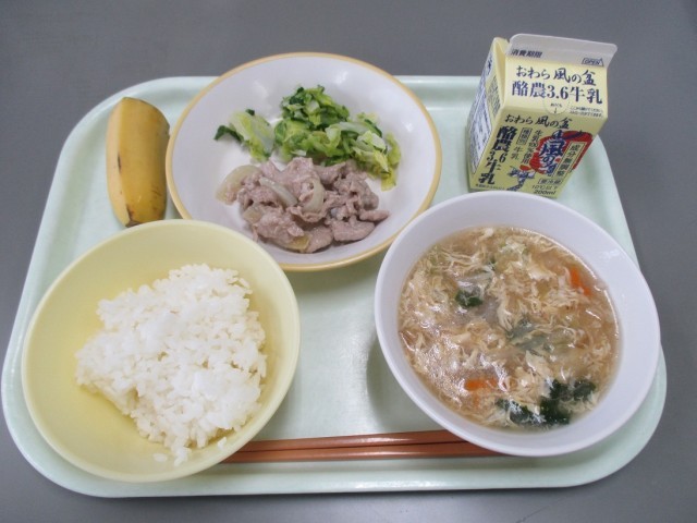 今日の果物は、バナナでした。バナナは、和名で、「芭蕉実(ばしょうみ)」と呼ぶそうです。芭蕉の葉に似ていることから、この名が付いたそうです。バナナには、お腹をきれいにしてくれる食物繊維、体をつくるたんぱく質等たくさんの栄養が含まれます。手軽に食べられるバナナですので、おやつ代わりにもいいですね。今日もおいしくいただきました。