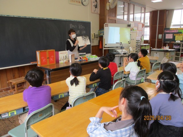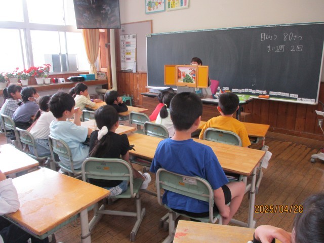 4月28日月曜日に図書室オリエンテーションがありました。始めに司書の先生が「3びきのこぶた」の紙芝居を読んでくださいました。そのあと「かわいい3びきのオオカミ」という本を紹介してくださいました。何度も恐ろしい大豚に家を壊されたかわいいオオカミが最後に作った家は、とてもすてきな家でした。発想の転換がおもしろい本でした。どんな家を作ったのか、ぜひお子さんに聞いてみて下さい。そのあと、自分たちでも本を借りました。読み聞かせしてくださったおかげで、昔話を手にする子供も多かったです。これからいろいろなジャンルの本を読んでいってほしいですね。