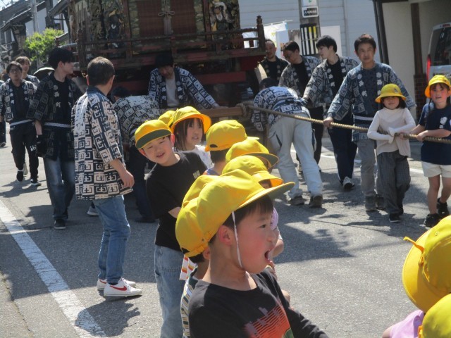 その後、曳山を曳かせていただきました。綱を引くたびに「ワッショイ!ワッショイ!」の子供たちのかけ声が西町に響いていました。
