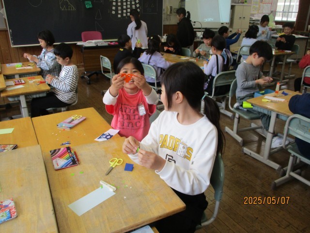 今年から、1:00~1:15までは読書タイムとなりました。じっくりと読書をしている子供が多いです。そこで折り紙を使ってしおりを作りました。