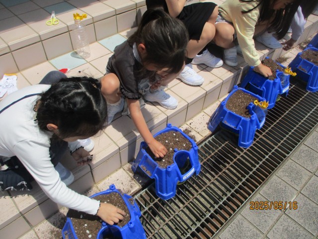 あさがおの種を観察した後、自分の鉢に大事に植えました。