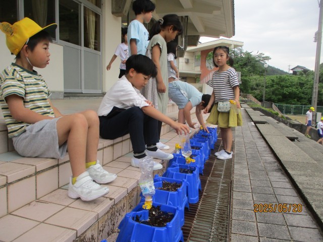 今日は土の状態を見ながら、あさがおにとってどのくらいの水の量が適切かを考えて水やりをしていました。