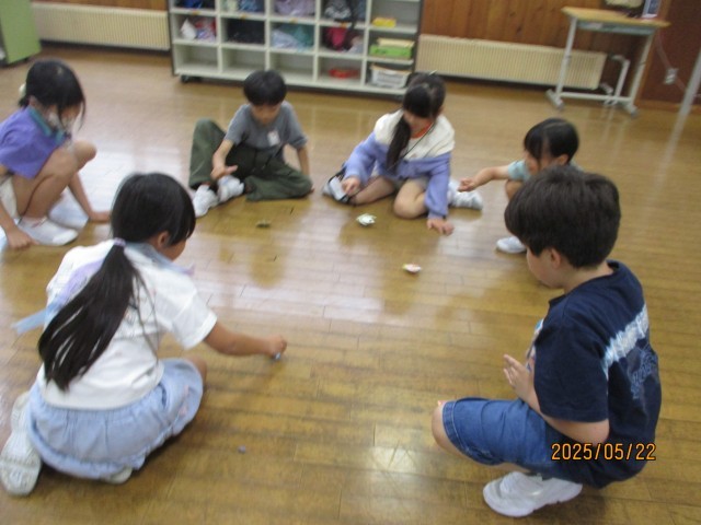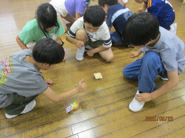 今国語では「こまを楽しむ」という説明文を学習しています。そこで、牛乳パックを使ってこまを作りました。こまに模様を描いて回してみると、模様が違って見えました。「こまを楽しむ」という教材文の「色変わりごま」になっていることに気付きました。