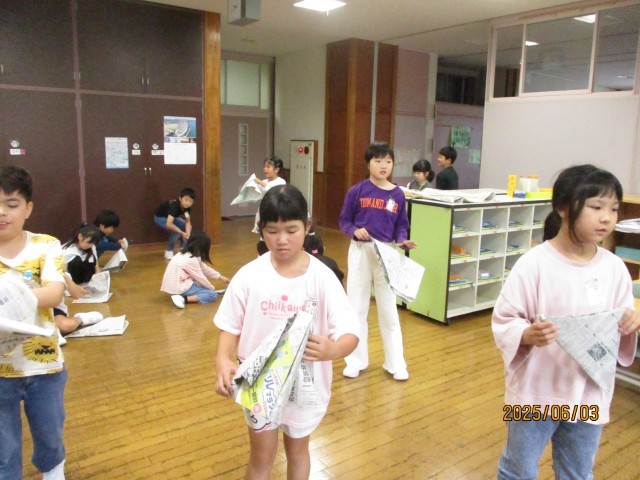 6月6日に体力記録会を行います。それに向けて、ボール投げの練習をしました。まずは、紙鉄砲を作って、勢いよく腕を振る練習をしました。なかなかよい音が出せなかった子供も、練習を繰り返すうちにだんだん腕を振りきることができ、よい音が出るようになりました。その後体育館に移動して、体を横にして首を前に向けてなげるという投げる姿勢を意識して、ボール投げの練習をしました。いろいろなことに気を付けて、ボールを遠くまで投げられるようになるといいですね。