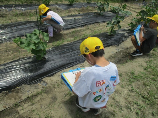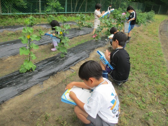 学校菜園で育てている野菜が、ぐんぐん大きく育っています。