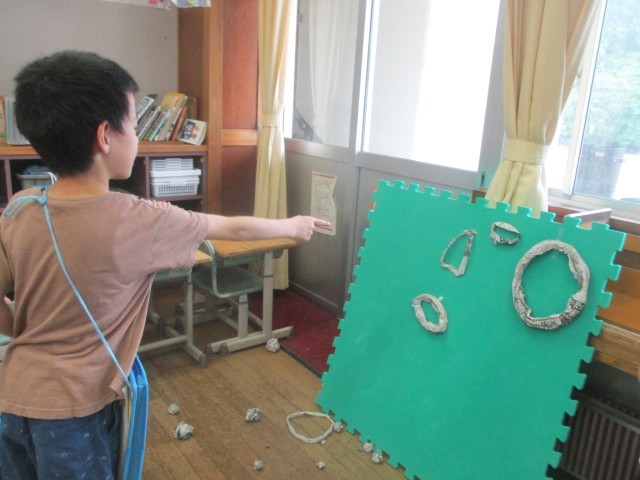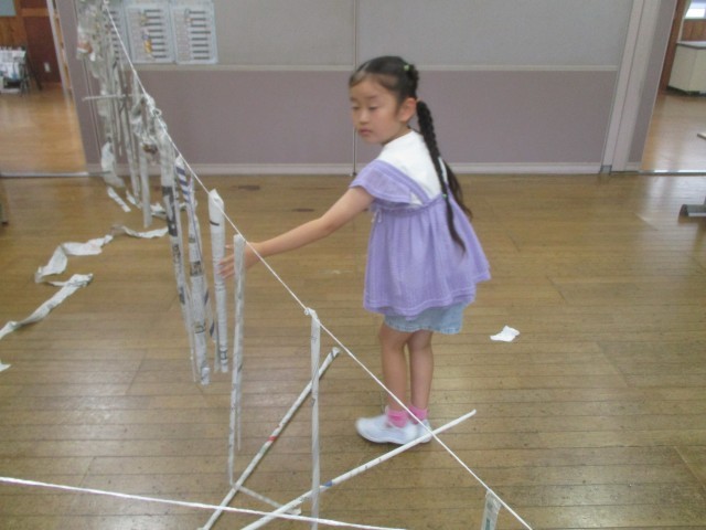 新聞紙を細長くする「ほそほそながながランド」では、細長くした新聞紙をロープでつり下げ、くぐったり触ったりしました。