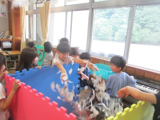 教室中を新聞紙でいっぱいにして、体全身を使って楽しみました。