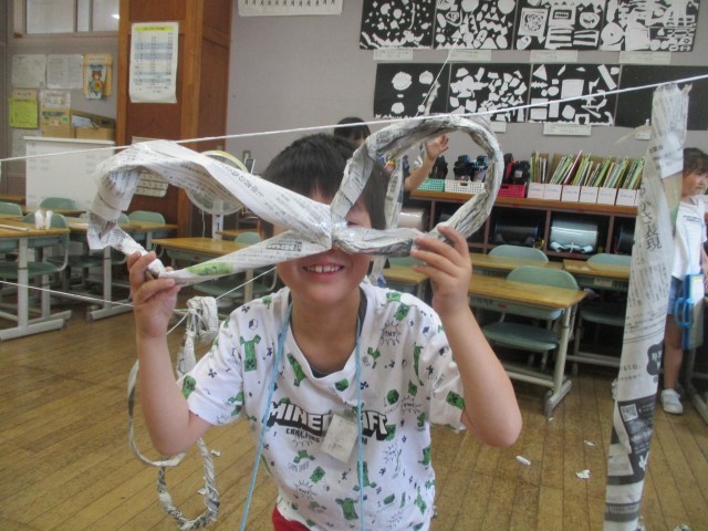 図画工作科「しんぶんしとなかよし」の学習では、新聞紙の特徴「ちぎる」「丸める」「細長くする」を生かして造形遊びをしました。
