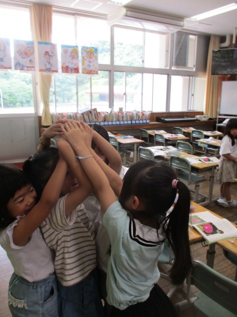 つぼみが開いていく様子を動作化しながら、文章で述べていることの理解を深めています。
