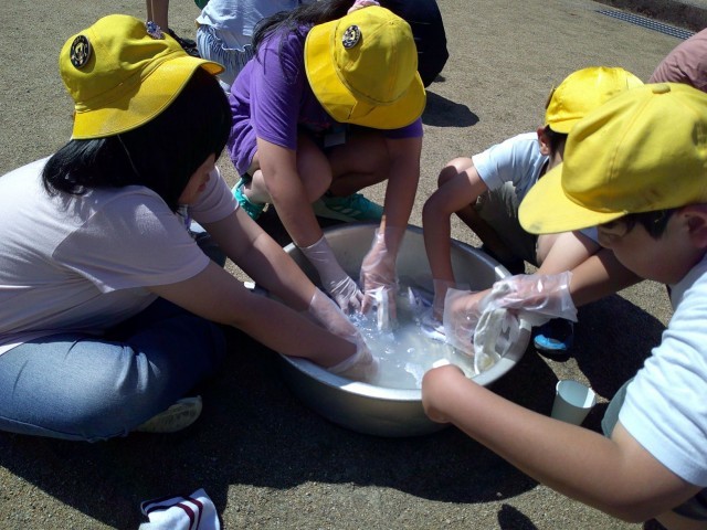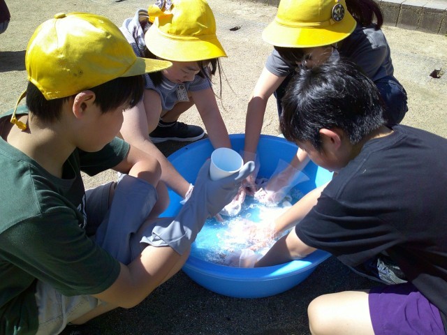 「じゃあ僕が洗剤を入れるね」「そろそろ水代える?」と話合いながら取り組んでいました。