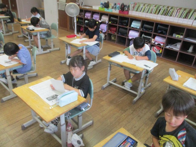 「自分のすきなところを伝えよう」をめあてにし、「おうちの人に劇で伝えたいな」「友達に絵本で伝えたいな」「絵を描いてみたい」と一人一人思いをもって学習に取り組んでいます。