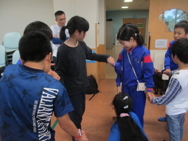 まずは人間知恵の輪に挑戦です。最初はなかなか輪をほどくことができず苦戦しましたが、2回目の挑戦からは「ここくぐってみる?」「こっちいってみようよ!」