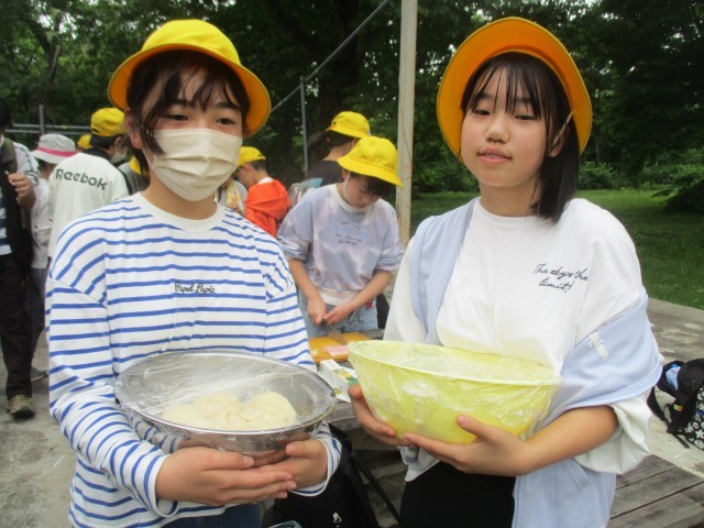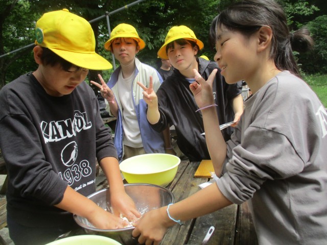 食材を準備するチームは、生地作りから始めました。小麦粉に水を混ぜて生地をこねます。「おいしくな~れ」と言いながら、力を込めてこねました。