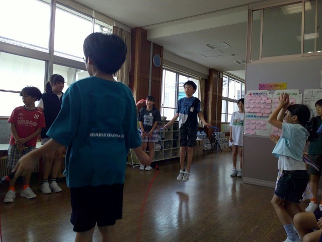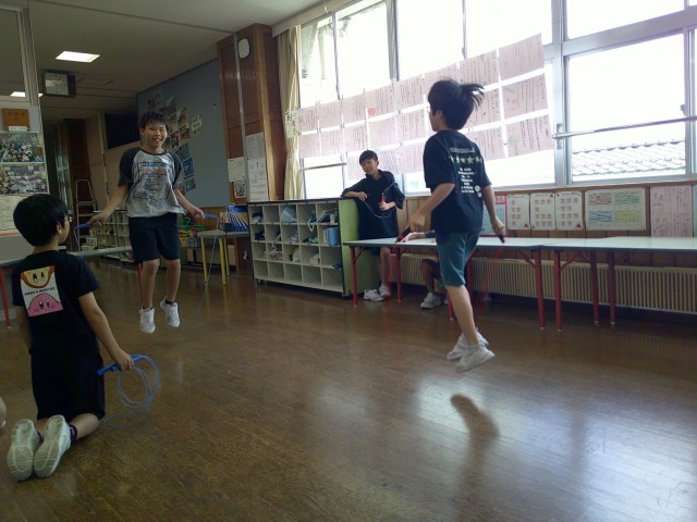 「委員長!縄跳び勝負しよう!」「団長に負けないぞ!」と意気込む下級生に対して、6年生も負けないように本気で勝負しています。