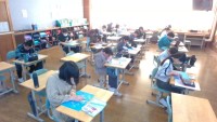 書初めの学習では、「平和な海」という題材をもとに、集中して丁寧に練習に取り組み...