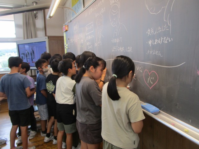 「心」を形に表すとはどういうことなのか、友達と話し合った考えを黒板に書いています。