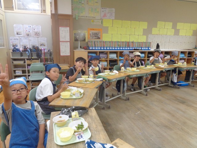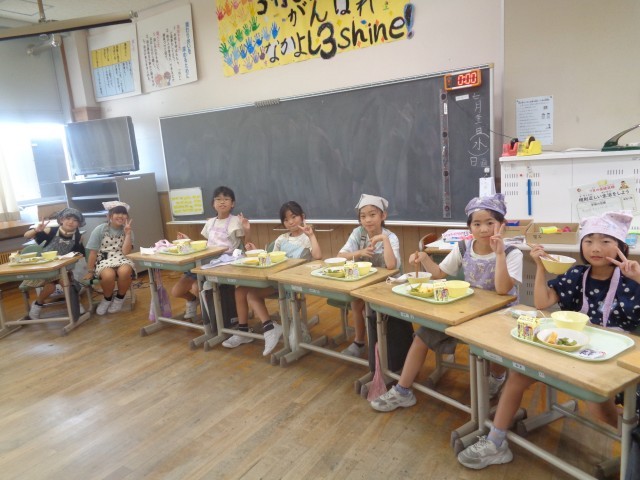 1学期最後の給食だから、みんなで輪になって食べよう!という提案をしてきた子供たち。みんなで仲良く給食の時間を楽しみました。