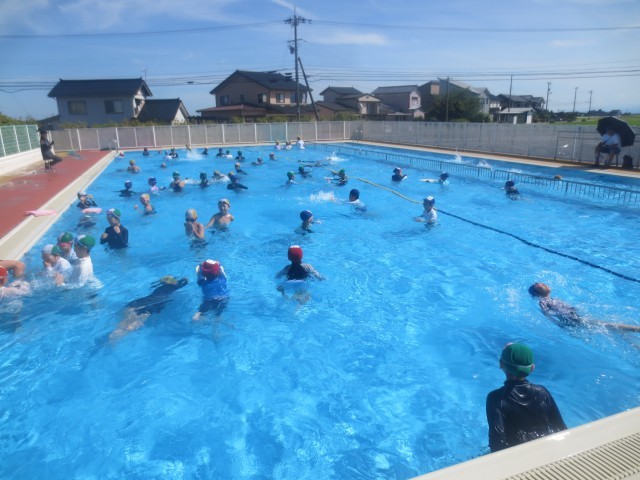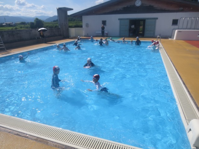 気温が高いため、時間短縮でプール開放を行いました。暑い中でも、子供たちは、元気いっぱいに泳いでいました。