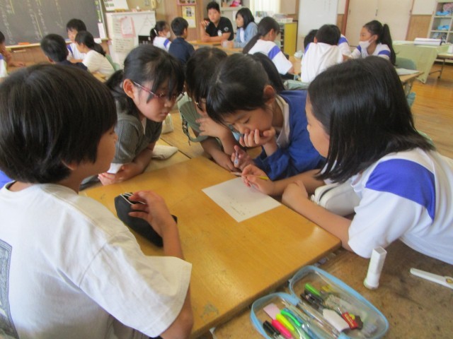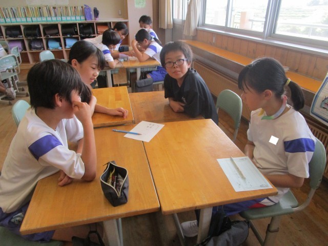 今日から授業が始まりました。朝活動では、班のみんなと知恵を出し合って、クイズに取り組みました。