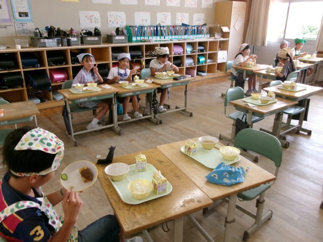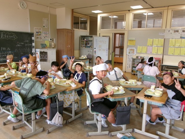 給食をもりもり食べています。今日は、揚げ出し豆腐のごまだれがけが人気でした。