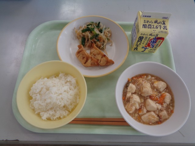 マーボー豆腐は、漢字で、「麻婆豆腐」と書きます。「麻」は、「顔に付いていぶつぶつしたできもの」のこと、「婆」は「おばあさん」のことを表すそうです。なので、「顔にできものができている、おばあさんがつくった、豆腐料理」と言われています。おもしろいですね。今日もおいしくいただきました。