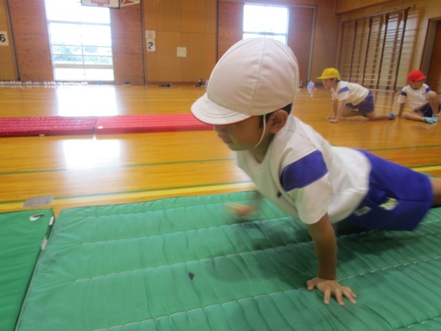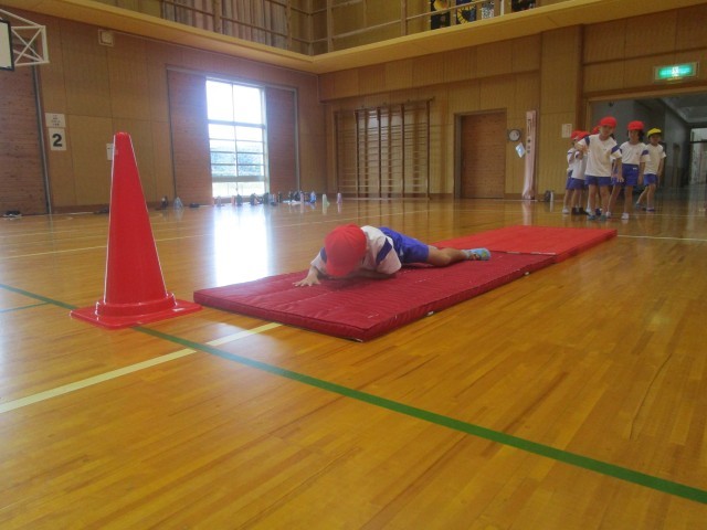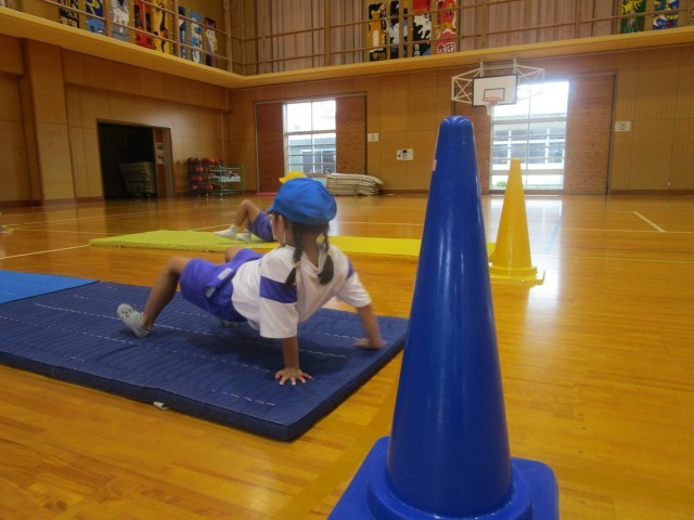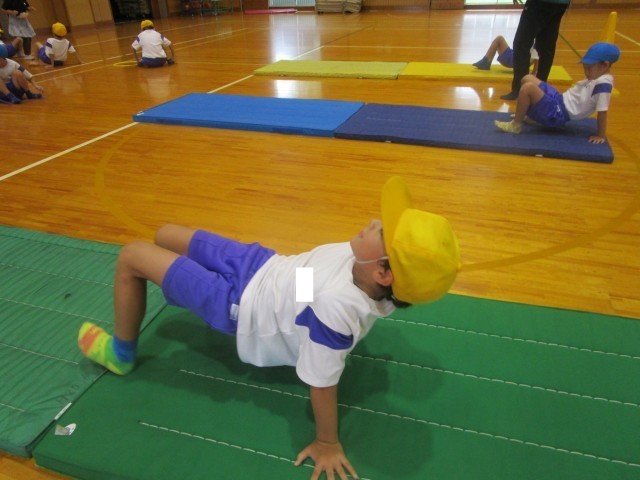 マット運動の学習を行っています。今回は、動物歩きと丸太ころがりをしました。