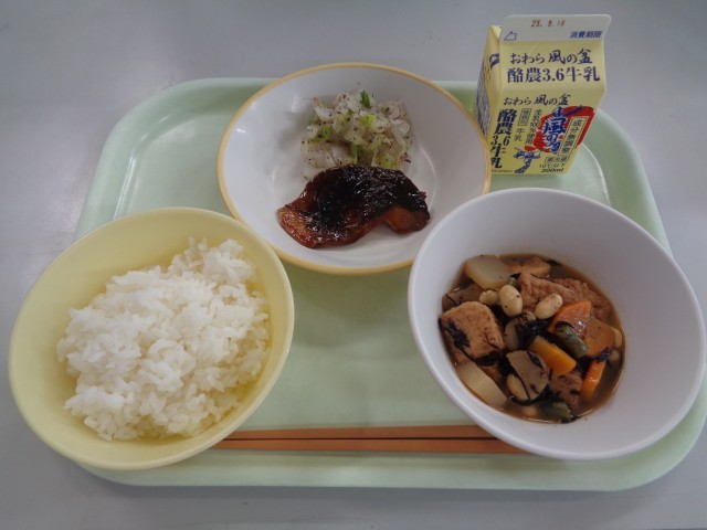 今日の大豆の磯煮には、ひじきがたっぷり入っていました。ひじきは海藻の仲間で、食物繊維、鉄分、カルシウム等、体に必要な栄養素が豊富です。成長期のみなさんに、ぜひ食べてもらいたい食材です。煮物以外にも、サラダや卵焼き、炊き込みご飯にもアレンジできますので、ご家庭でも食べてみてください。今日もおいしくいただきました。