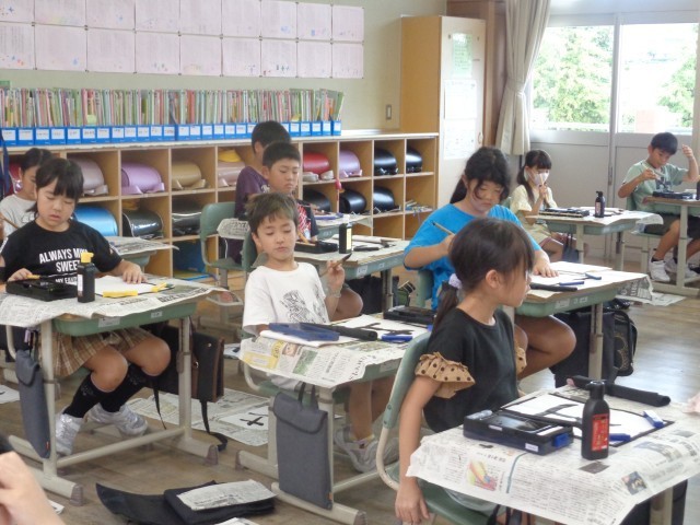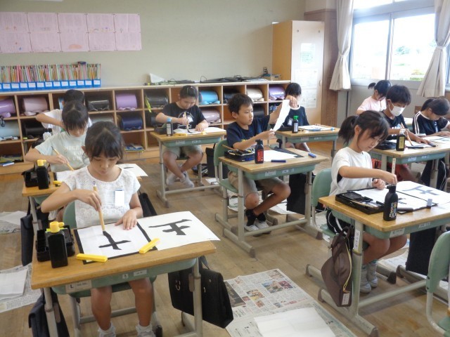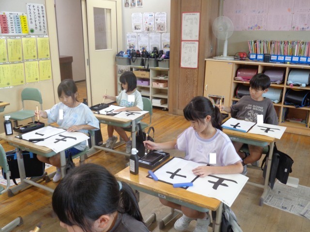 2学期初の書写は、たて画の練習をしました。筆を立てることを意識して、「土」を書きました。